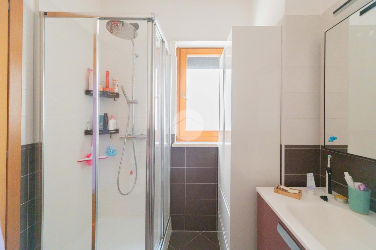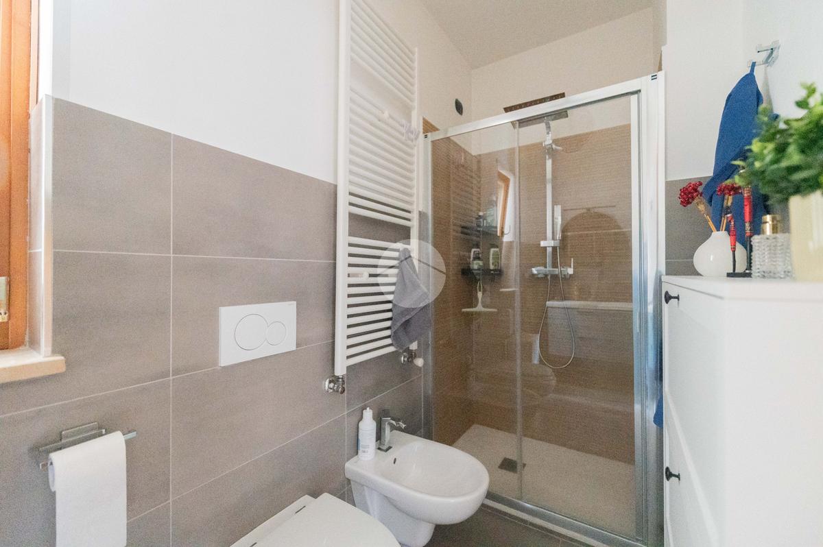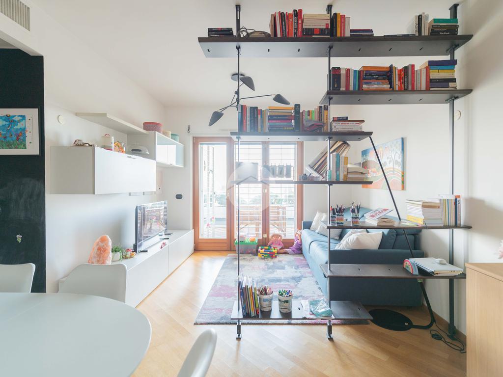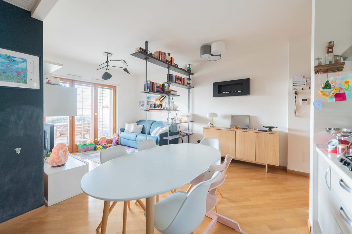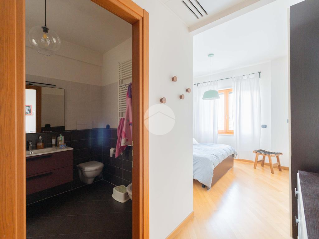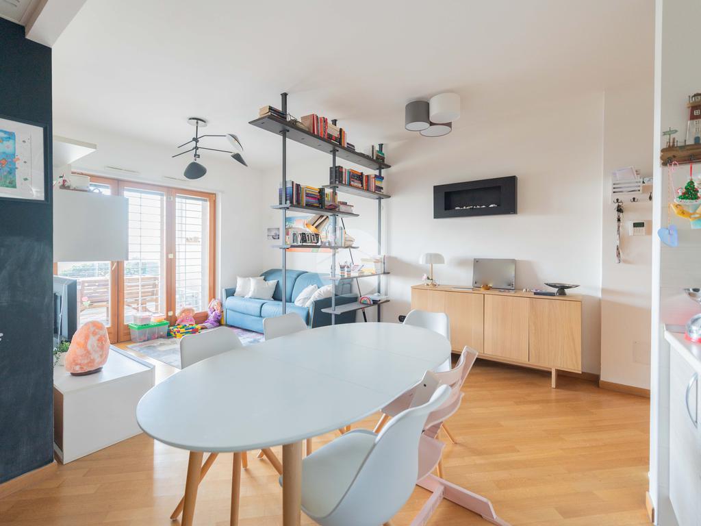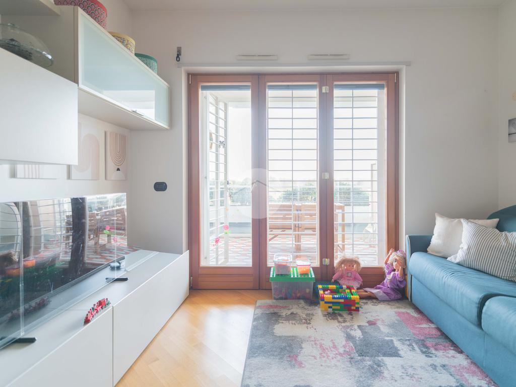 L’ingresso conduce ad una luminosa zona giorno dotata di pavimento in parquet, angolo cottura finestrato con penisola, e accesso diretto al terrazzo verandato, recentemente ristrutturato con dettagli di pregio. La zona notte è composta da una camera matrimoniale con bagno en suite, una seconda camera e un ulteriore bagno a servizio dell’abitazione.