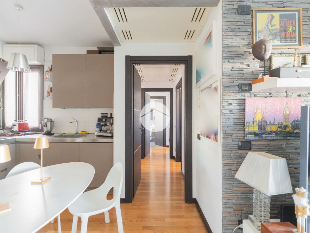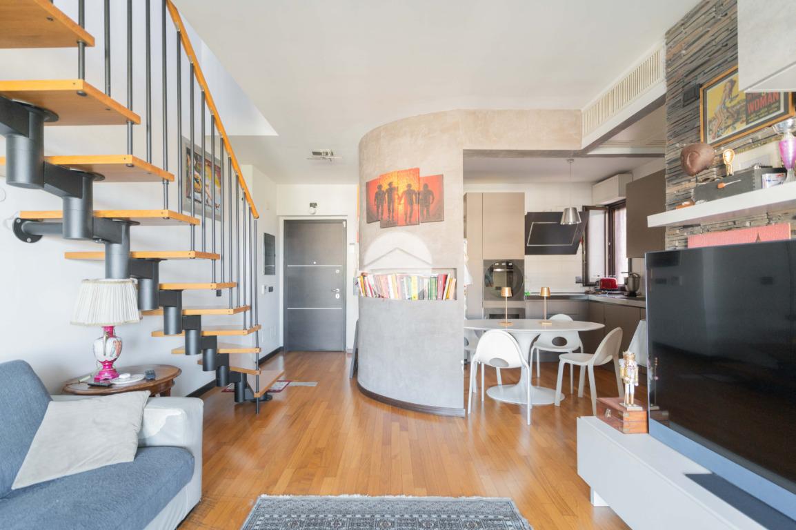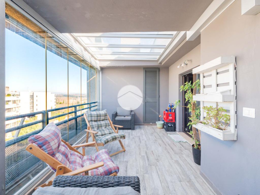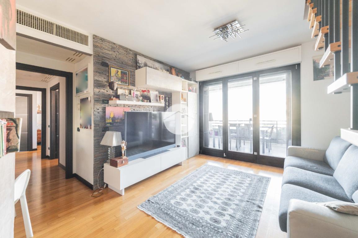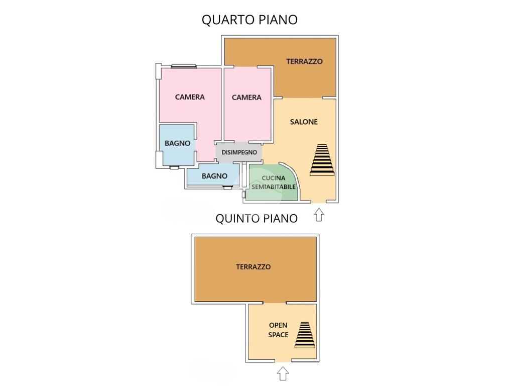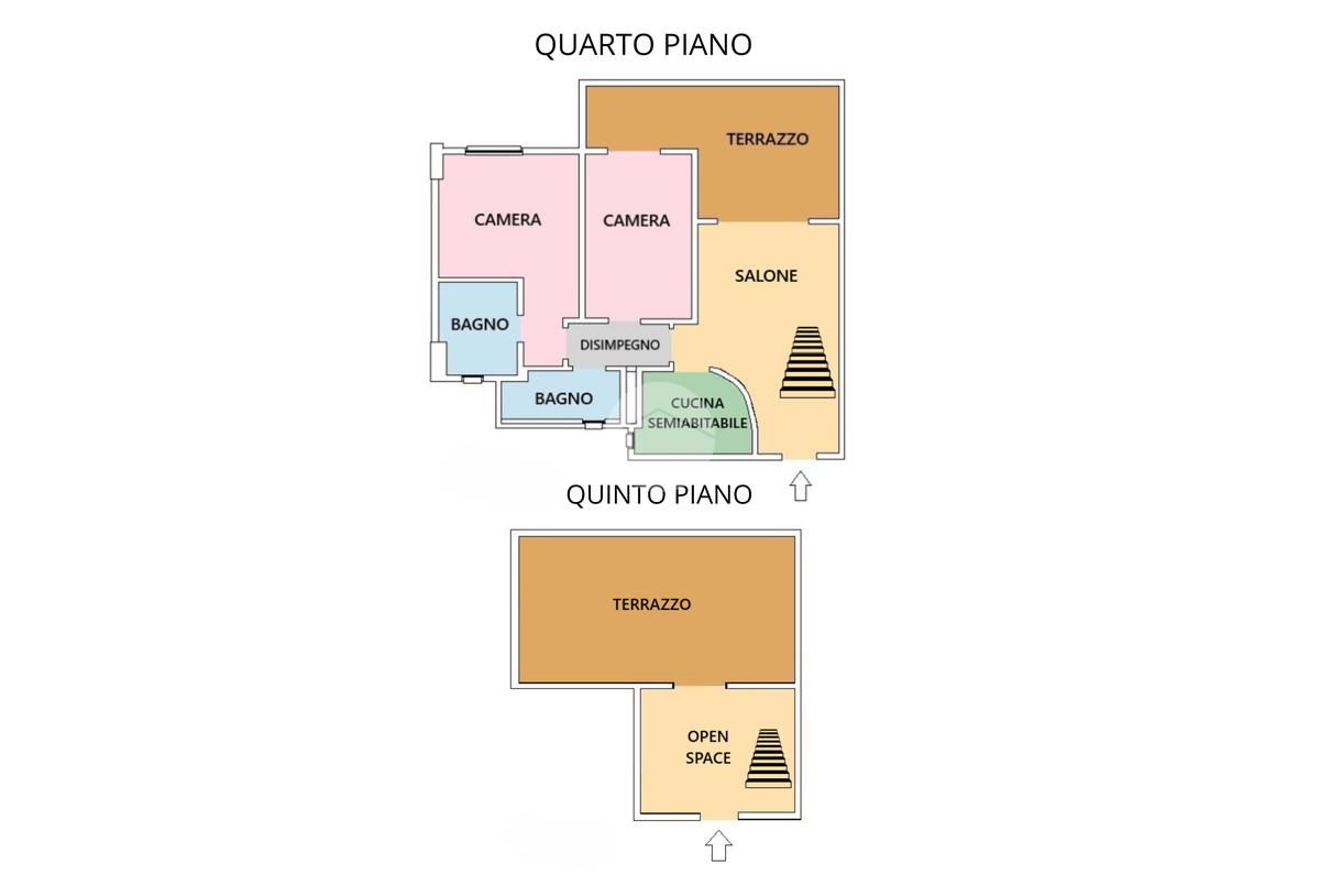 L'appartamento si sviluppa su due piani con ingressi indipendenti. Al quarto piano, l'ingresso conduce a un salone con angolo cottura finestrato e accesso al primo terrazzo verandato. Un disimpegno separa la zona notte, composta dalla camera matrimoniale con bagno en suite, una camera con accesso al terrazzo e un secondo bagno finestrato.