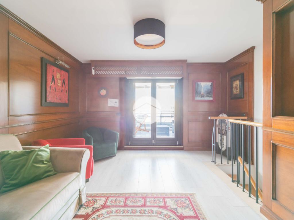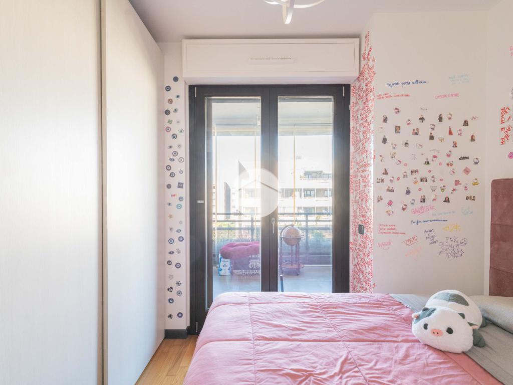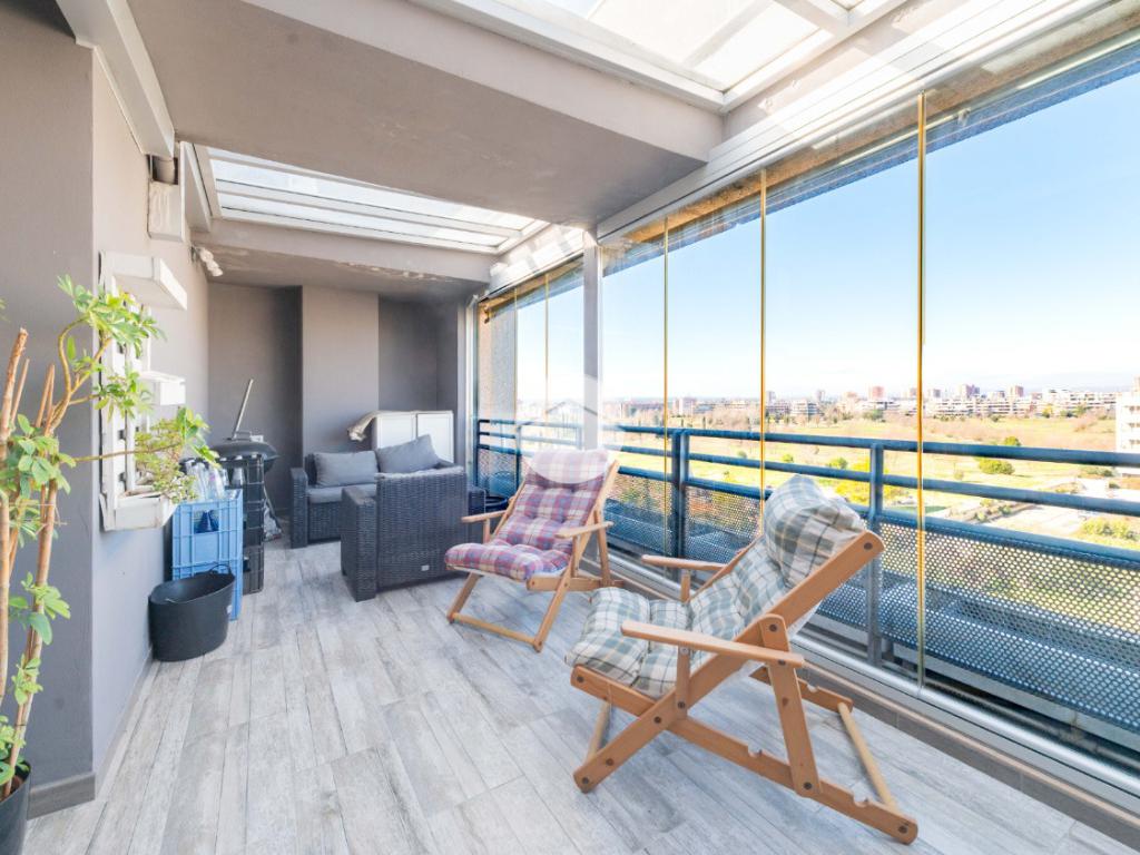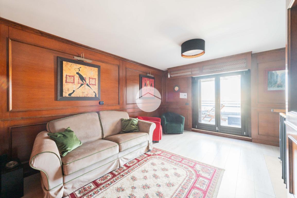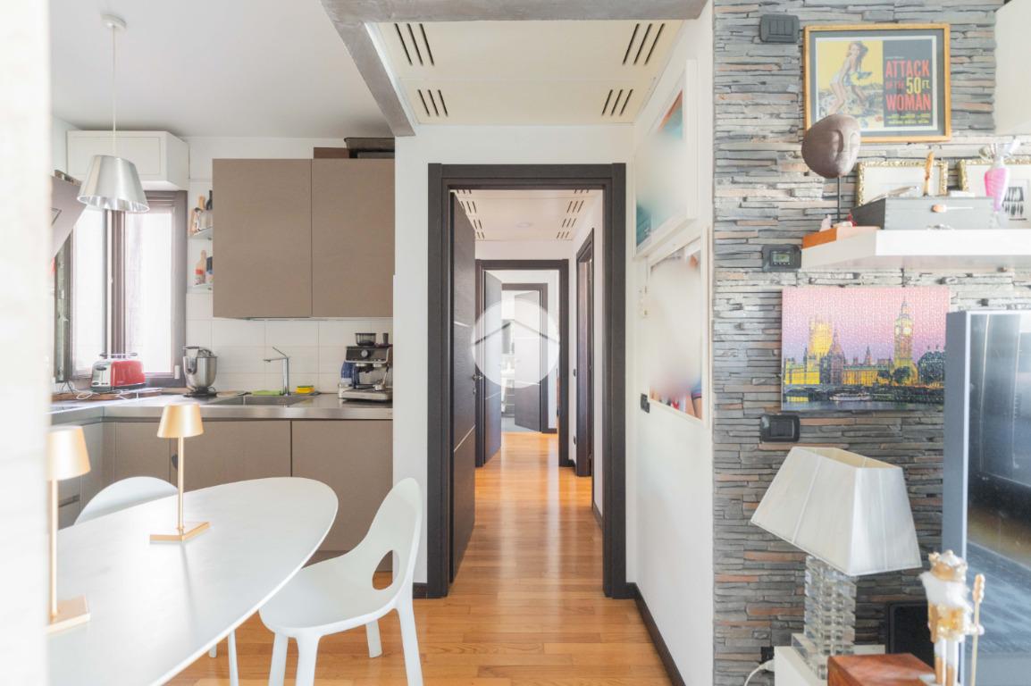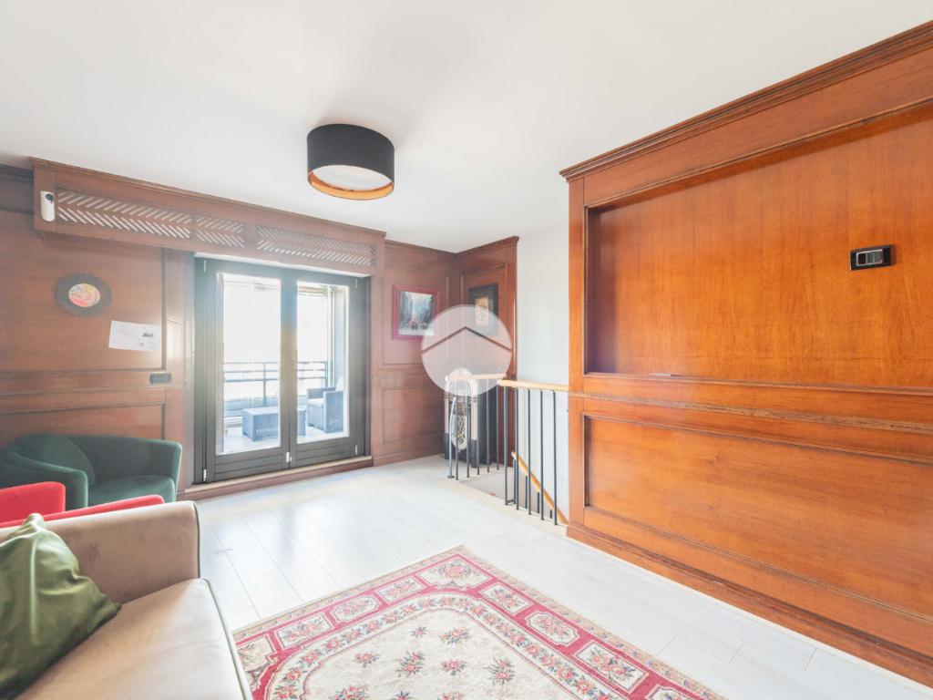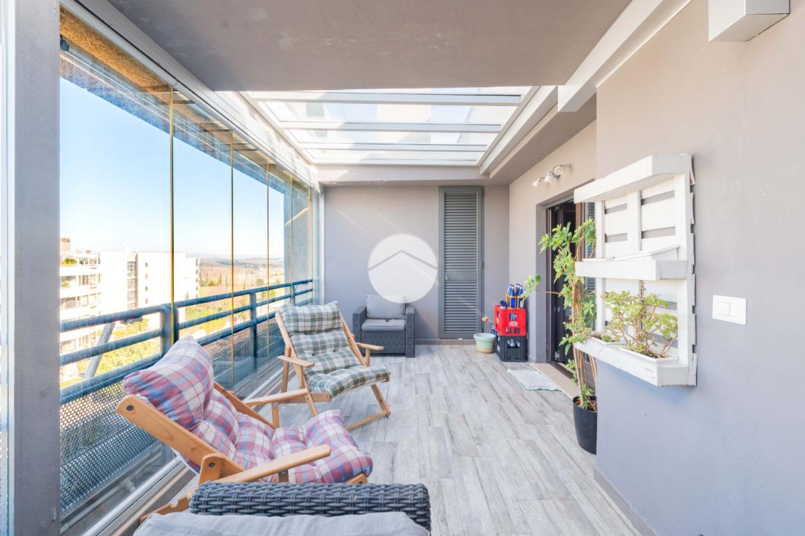 L'appartamento si sviluppa su due piani con ingressi indipendenti. Al quarto piano, l'ingresso conduce a un salone con angolo cottura finestrato e accesso al primo terrazzo verandato. Un disimpegno separa la zona notte, composta dalla camera matrimoniale con bagno en suite, una camera con accesso al terrazzo e un secondo bagno finestrato.